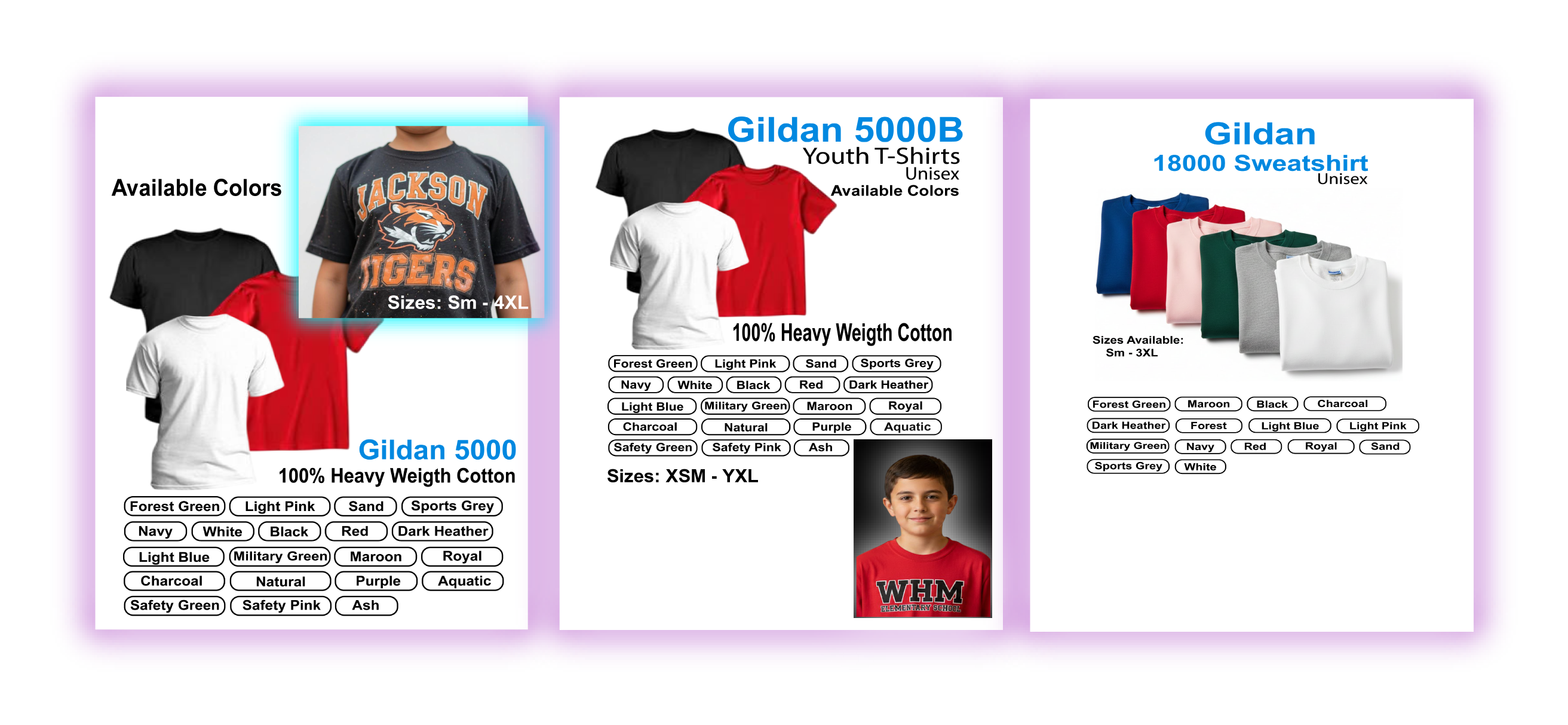 We use 100% Premium Cotton Gildan 5000 T-shirts. Create a perfect keepsake that will stand out in a crowd.